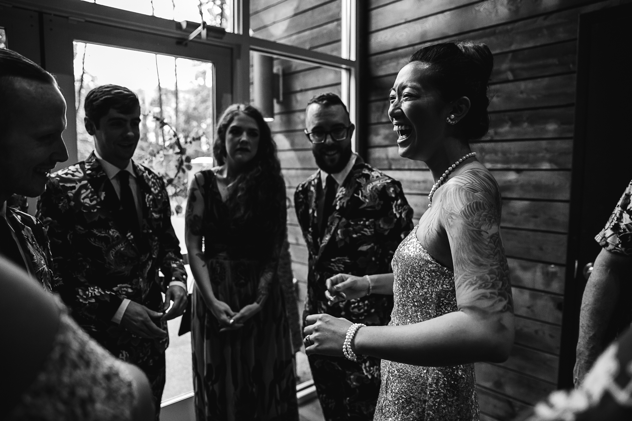 Sean and I have called many cities our home, so we wanted to incorporate touches of each: New York, Shanghai, and now Amsterdam. Our invitations and venue are classic Americana. The wedding party wore suits in traditional Chinese Dongbei floral print. We brought Dutch stroopwafels for all our guests. Because my ma's side of the family is from Honolulu and my favorite Elvis movie is Blue Hawaii, we played Elvis' "Hawaiian Wedding Song" and "Rock a Hula" at our ceremony, and the bouquet and boutonnieres for the family featured protea flowers.”