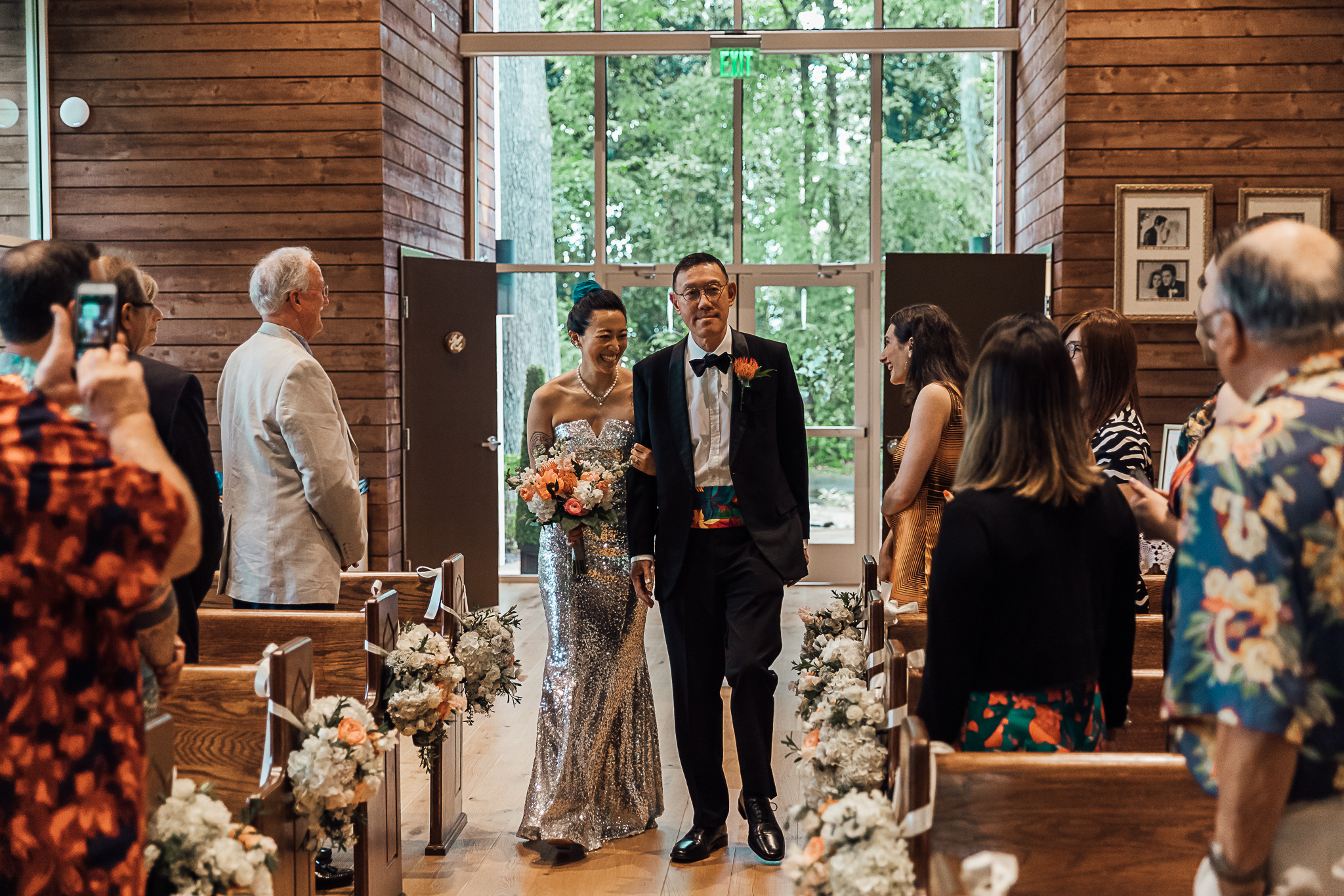 “We weren't planning on having flowers at our ceremony in the Chapel in the Woods, but serendipitously a TV crew was filming there the day before and asked if we'd like to keep them up. They thought it'd be a shame to disassemble them - and we agreed! Special thanks to the Hallmark Channel and to the ghost of Elvis for this unexpected gift.”